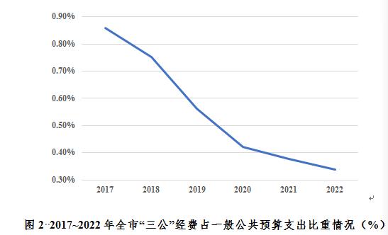 圖1、圖2說明:2022年全市“三公”經費下降至14111.26萬元,與2017年相比,減少了9343.66萬元,壓減了近40%,占一般公共預算支出比重下降至0.34%。