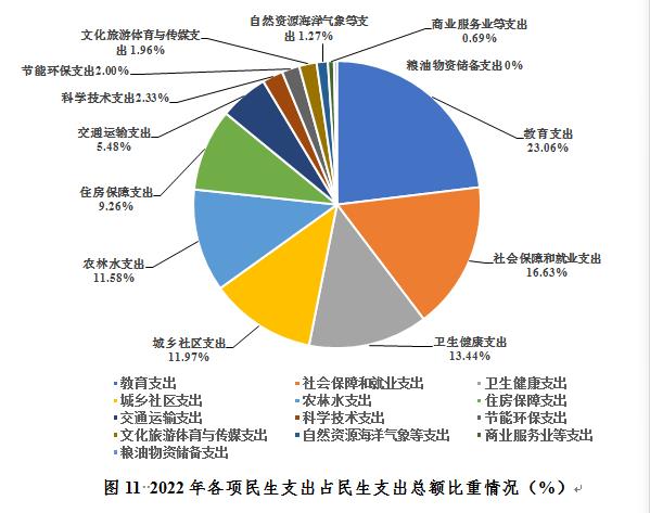 圖片說明:截至2022年,我市積極推進各項民生實事項目建設。其中,重點保障教育支出、社會保障和就業支出、衛生健康支出。我市始終堅持教育優先發展戰略,教育資源布局不斷調整優化,全年教育投入達99.17億元,占全市民生支出的23.06%;社會保障體系堅實有力,社會保障和就業支出達71.51億元,占全市民生支出的16.63%;深入推動衛生健康數字化轉型,積極打造數字健康“連云港模式”,衛生健康支出達57.78億元,占全市民生支出的13.44%。